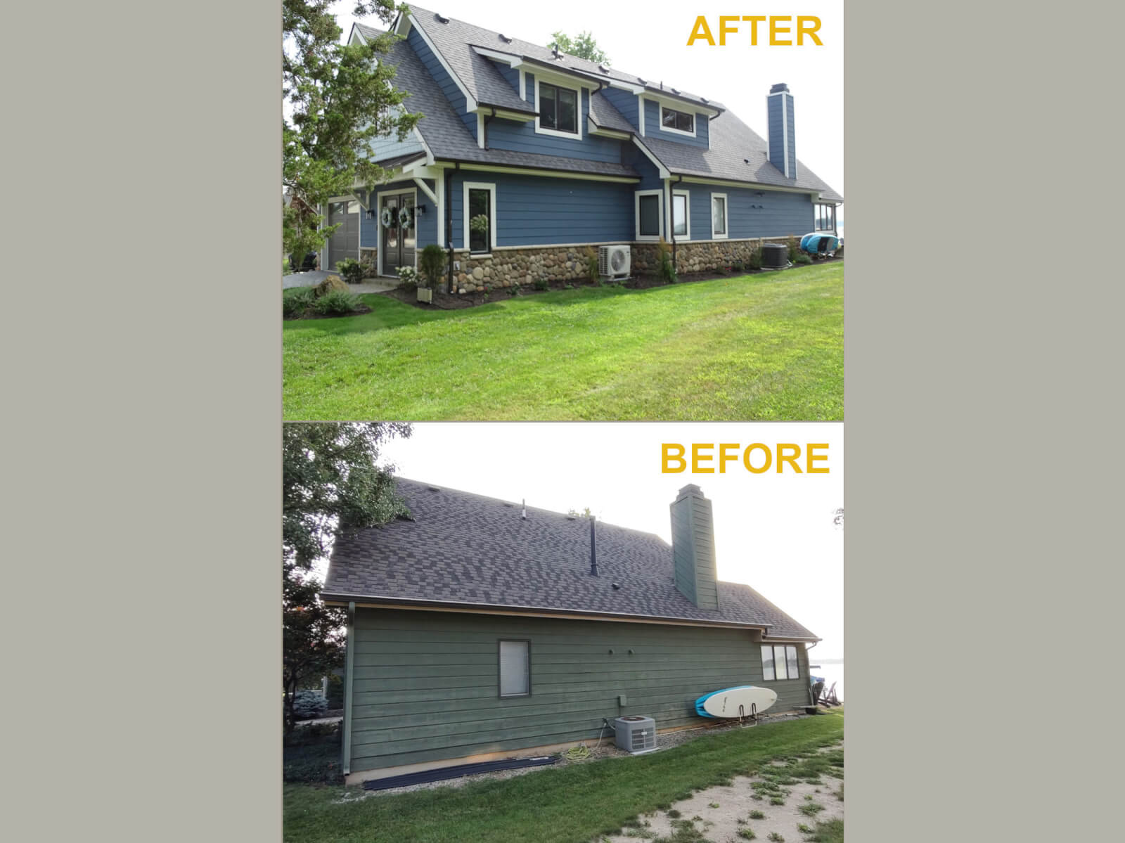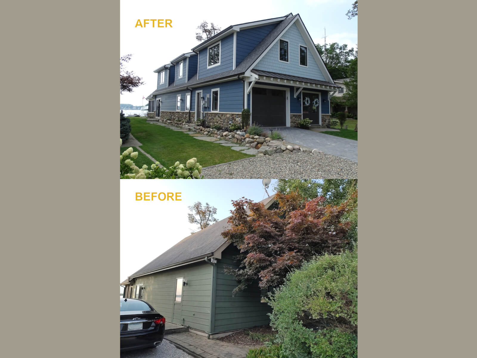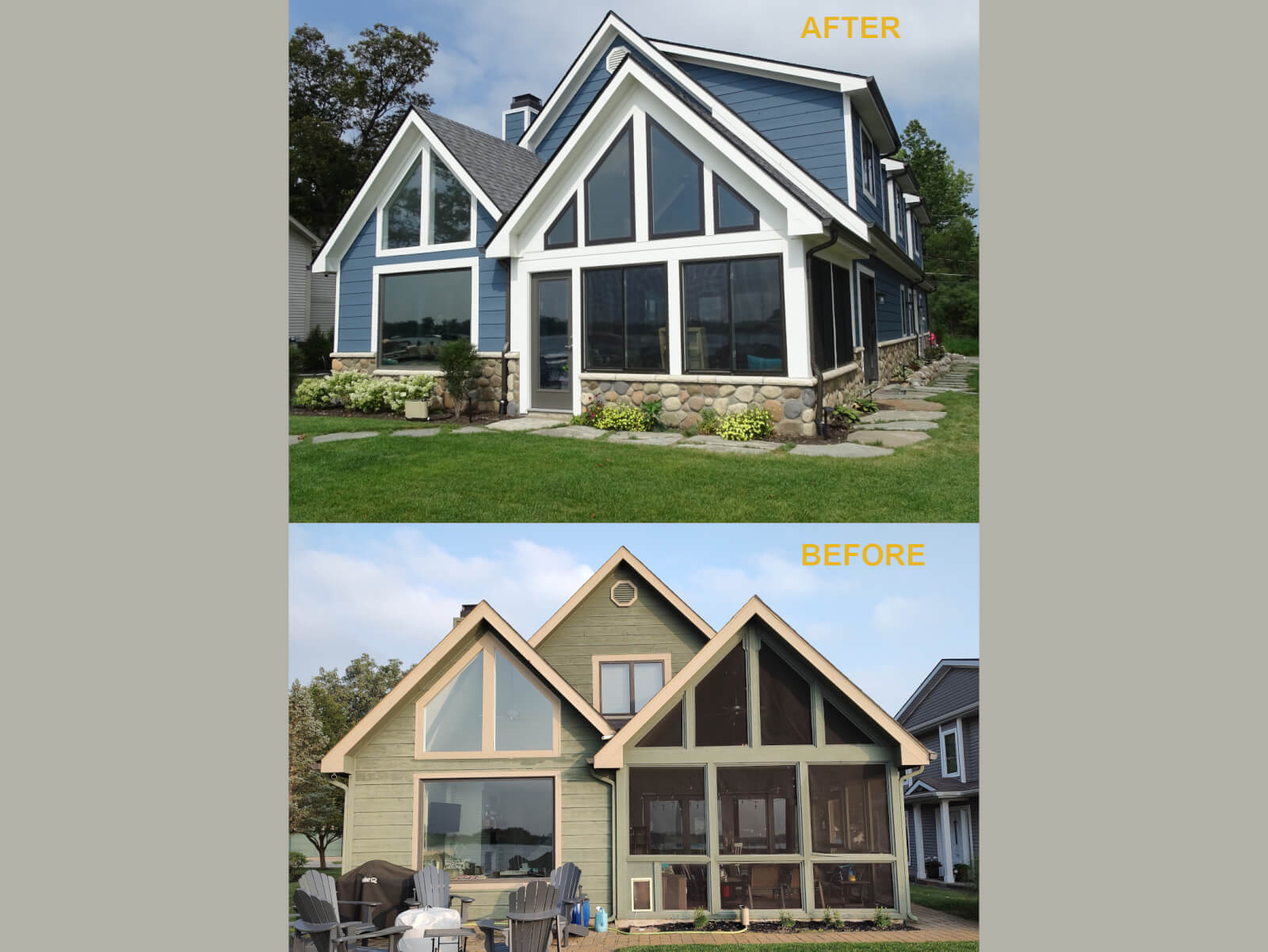 The existing exterior was clad in a unique patterned cedar siding which the owners preferred to keep. We were able to match the siding profile and some manufactured stone wainscotting was added to bring the exterior up to date.