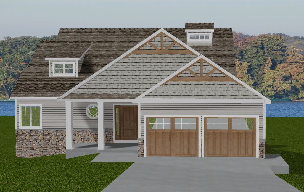 Lynn has designed a home with 1,693 sq. ft. of living area on the main level and 1,751 sq. ft. of finished area in the walk-out lower level. The owner’s suite is on the main floor which is designed to be universally accessible. An attached two car garage will provide convenience that was lacking in the original cottage. An open great room, kitchen and dining area will have a beamed cathedral ceiling and will offer spectacular views of the lake.