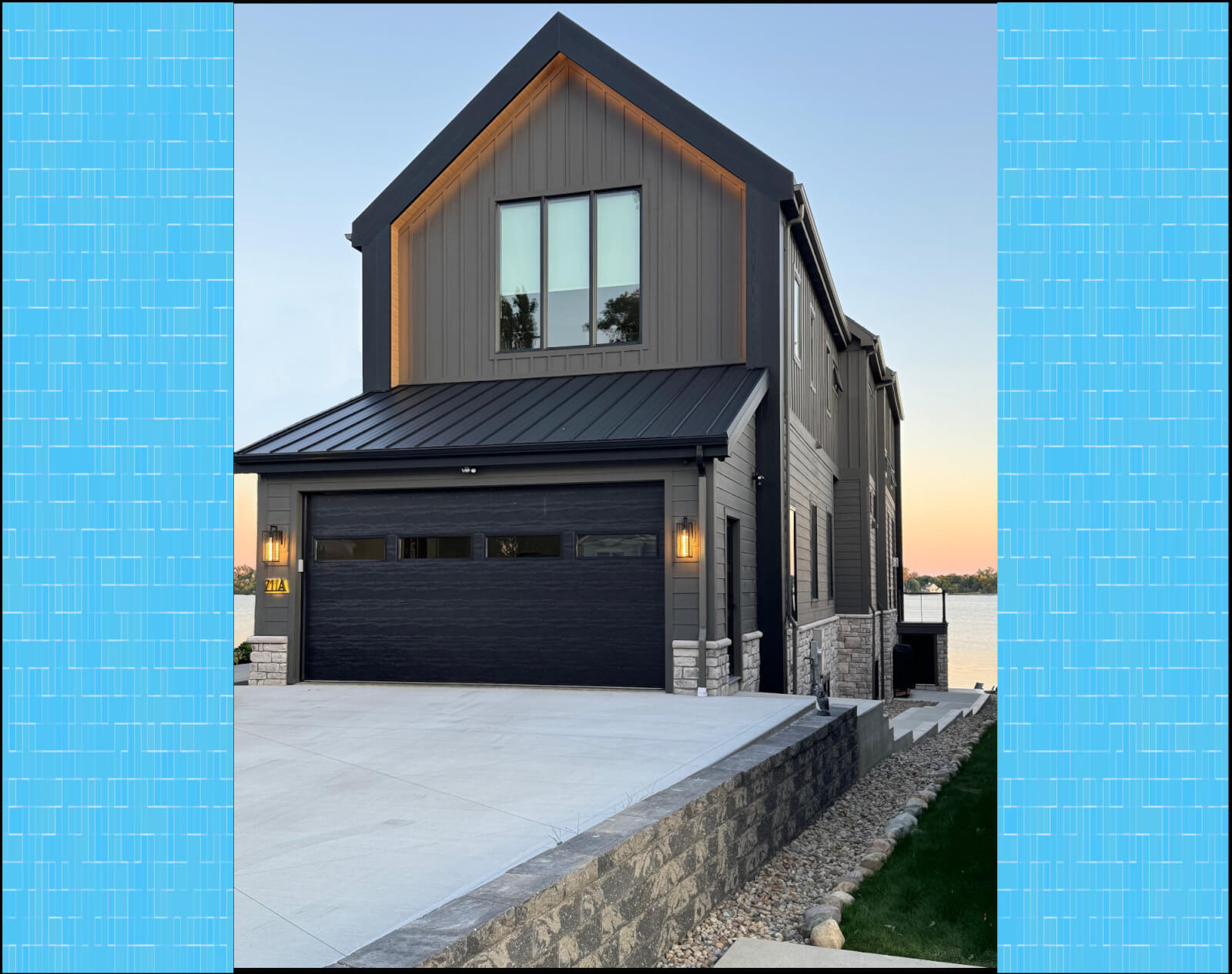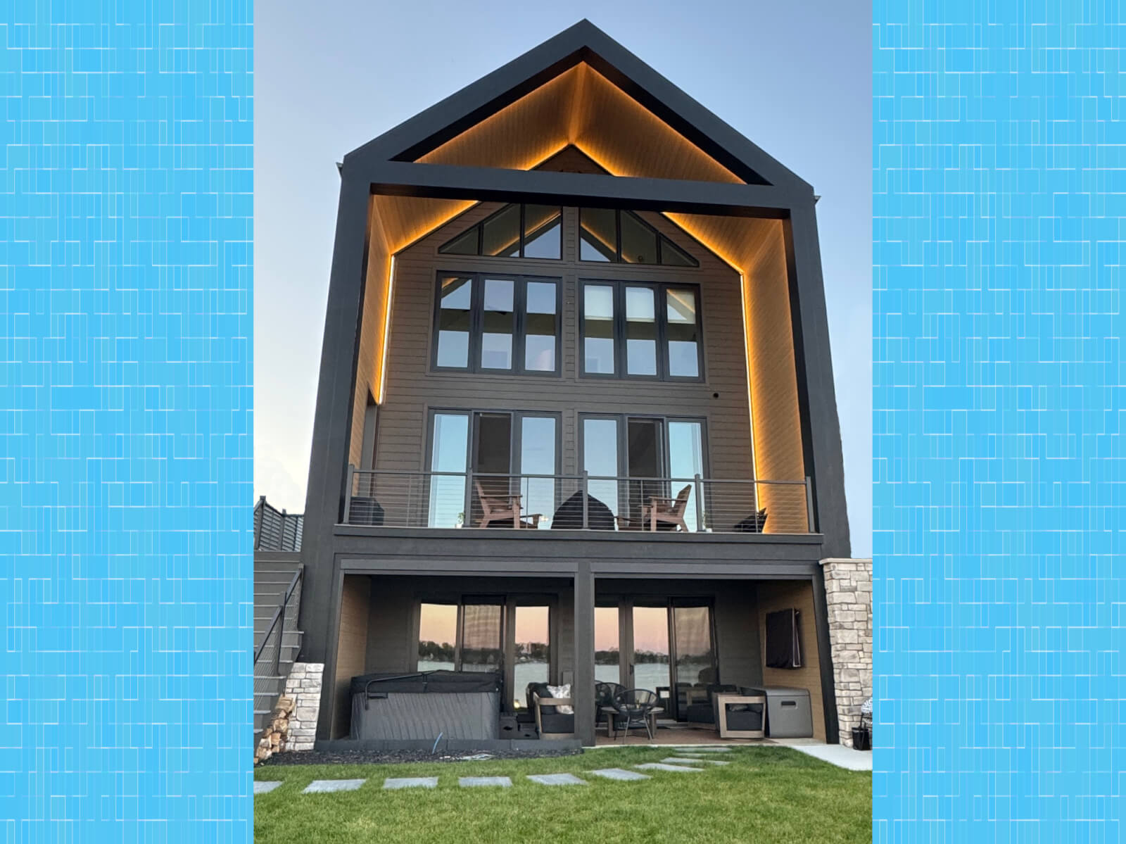 The characteristics of this homesite on beautiful Syracuse Lake presented not only design challenges but also made the construction of the home extremely difficult. With very narrow access at the road, the lot widens as it approaches the lake, providing a very generous lake yard. Considering the minimum side yard, lake, and street setback requirements, Lynn designed a home that fully satisfies the needs and desires of the owners. The home features 2,675 square feet of living area above grade and 1,105 square feet of living area in the walk-out basement. Of the five bedrooms, two are designed as owner suites. There is a large office above the two-car garage, a large recreation area in the basement, as well as an open kitchen and great room on the main level. A large exterior deck is accessible from the great room and an exterior stairway. A clever use of space is the lake-toy storage area tucked under that stairway. The recreation area and wet bar in the basement open onto a patio under the impervious deck, which serves as protection from the elements for a hot tub.